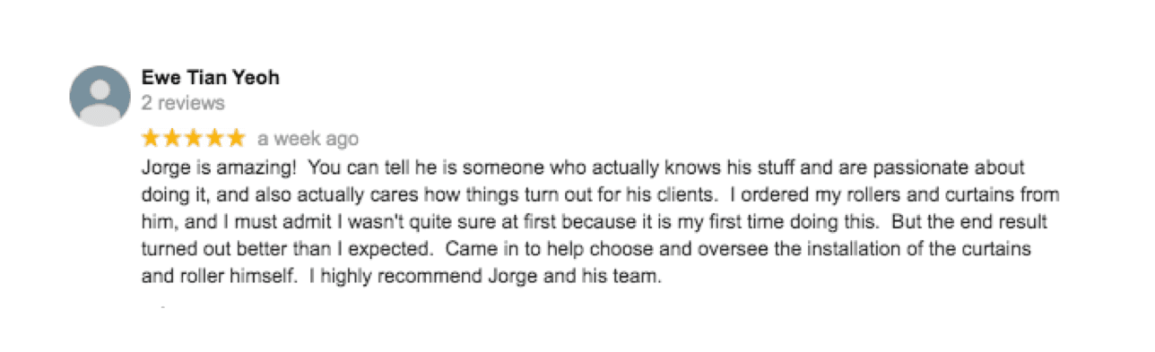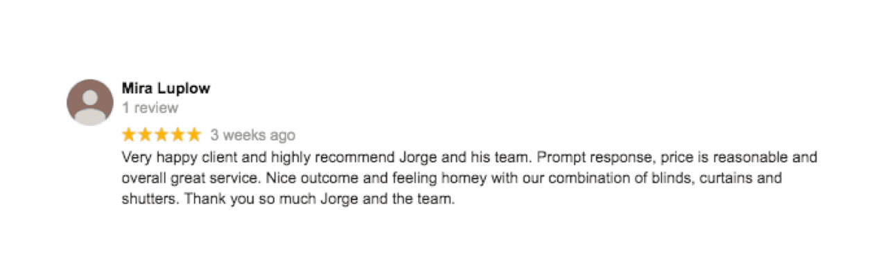 Excellent service from Jorge, quality curtains and blinds. Great communication and a reasonable price. We highly recommend Jorge and his team.