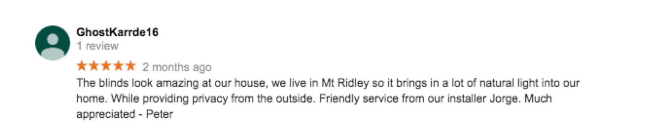 The blinds look amazing at our house, we live in Mt Ridley so it brings in a lot of natural light into our home. While providing privacy from the outside. Friendly service from our installer Jorge. Much appreciated